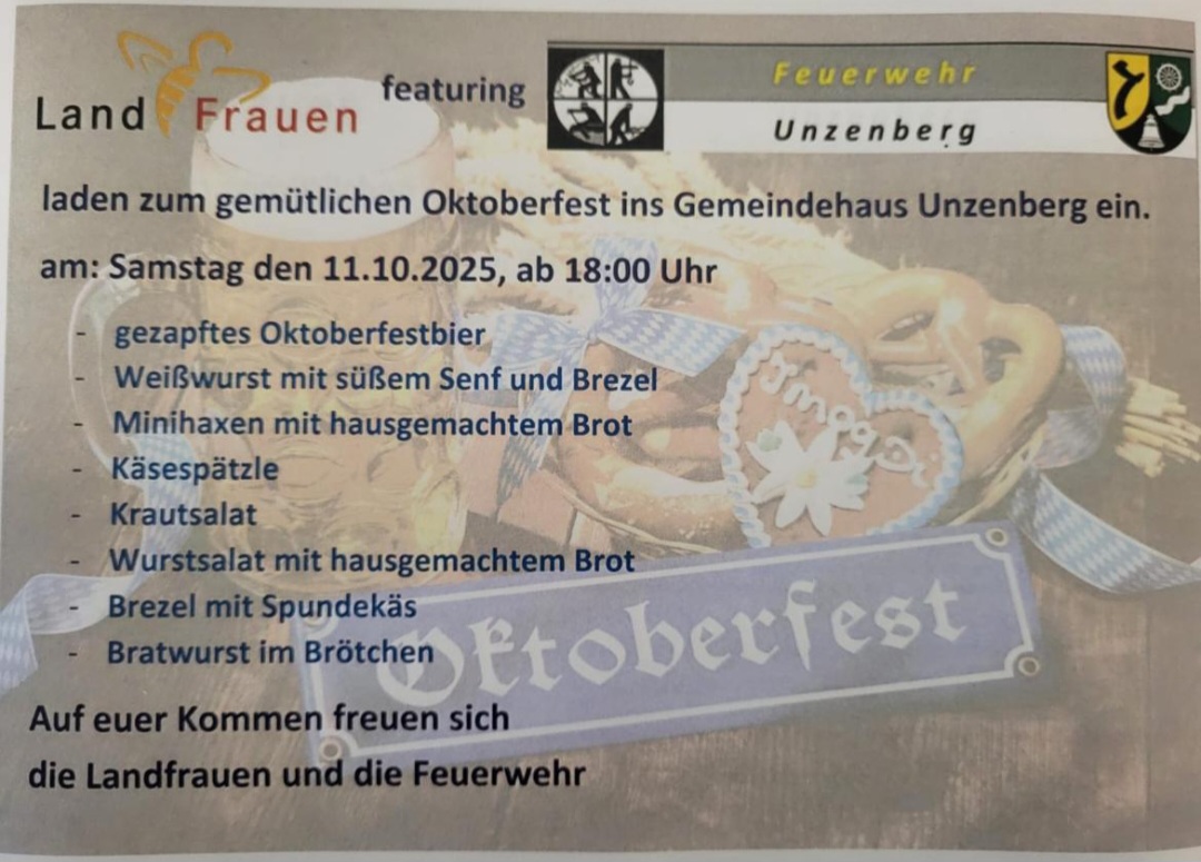Das diesjährige Oktoberfest fand am Samstag dem 11. Oktober 2025 , das mittlerweile schon Tradition ist, in Zusammenarbeit erstmalig mit den Landfrauen und der Feuerwehr Unzenberg statt.