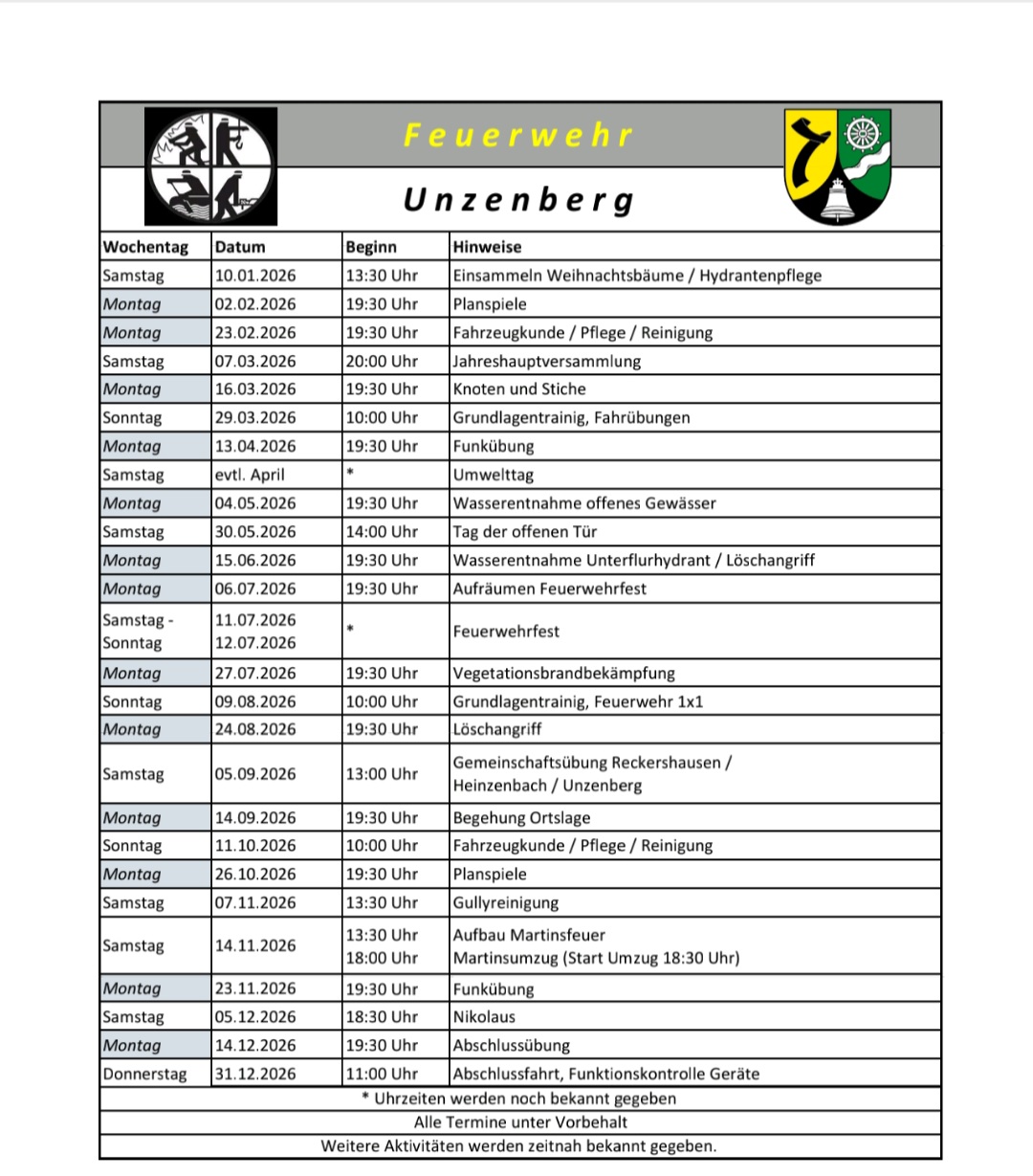 Aktueller Übungsplan der Feuerwehr Unzenberg für das Jahr 2026