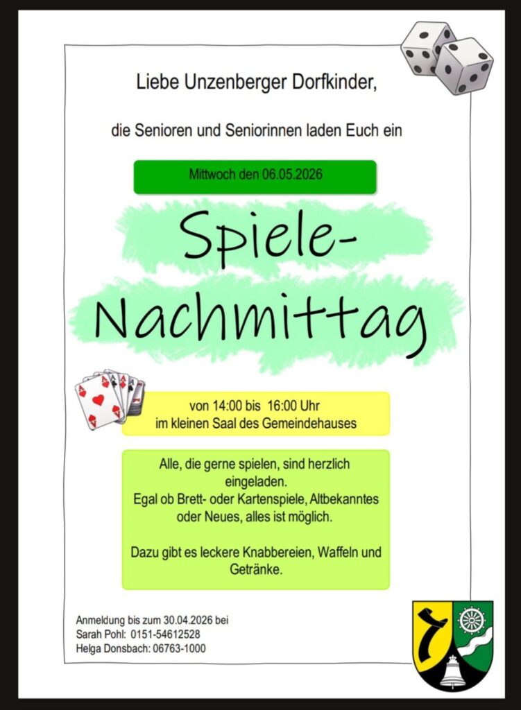 Spielenachmittag beim Mittwochs – Treffen am 06.Mai 2026 Gemeindehaus Unzenberg