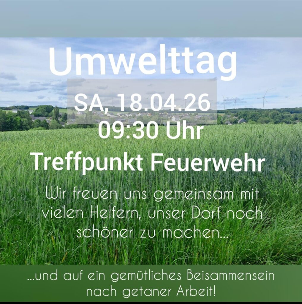 Am Samstag,den 18.04.2026 findet ein Umwelttag in der Gemeinde statt.An verschiedenen Stellen der Ortsgemeinde sollen Arbeiten durchgeführt und die Gemarkung von Müll und Unrat befreit werden.Hierzu werden viele helfende Hände benötigt.Also packt eure Arbeitshandschuhe und was ihr sonst zum Müllsammeln benötigt ein und kommt um 09:30 Uhr zum Feuerwehrhaus.Nach Abschluss der Arbeiten gegen 13 Uhr findet dann noch ein gemeinsames Mittagessen statt.Wir freuen uns auf viele Helfer groß und klein.